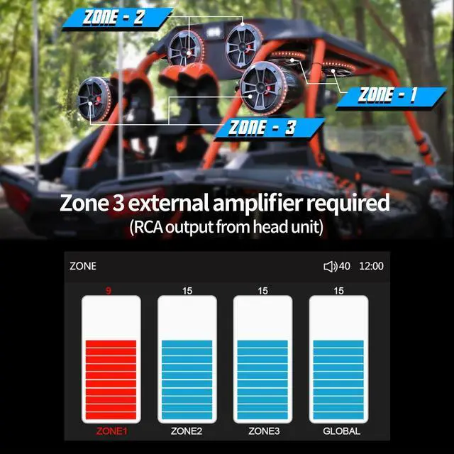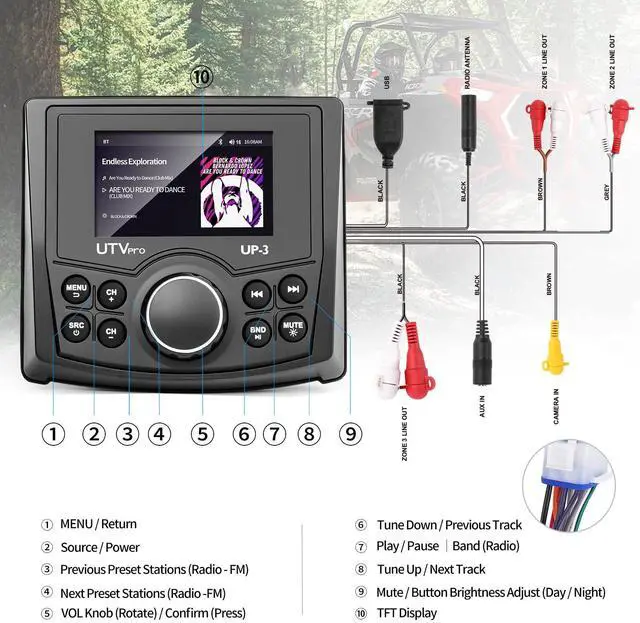 ^^ 2line output: UTVPRO stereo by auxiliary input to play mobile phone music (need additional collocation timeline), also have the RCA output to an external amplifier, can also through the SUBW subwoofer output bond play the bass, you can also use process ZONE function is used to do a separate volume for different areas. ^^ 3UTVPRO ocean radio is IPX5 waterproof and dust-proof with plastic cover, silicone keys, particular waterproof structure and technology. It has a circular hole with a diameter of 3 inches and a minimum installation depth of 3.75 inches. It is recommended to choose speaker impedance of 4OHM 30W and suitable for working temperature: -10-50 degrees, anti-vibration, anti-corrosion, high pressure water gun flushing completely no problem.