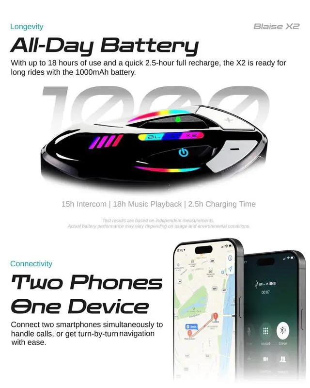 Features: Blaise X2 is equipped with a 1000mAh large battery and supports fast charging in 2.5 hours. It is designed with a split mounting base for simple, convenient installation and charging. The newly upgraded Bluetooth 6.0 dual-chip ensures stable connection; IP66 waterproof and dustproof rating adapts to all weather conditions ^^ If you have any questions or suggestions regarding our headphones, you can reach us anytime, and we will respond within 24 hours. Thank you for your support