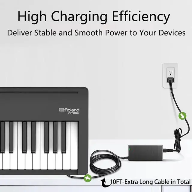 Output: 12V 5A 60Watt, Positive Tip; Free Extra Long AC Cable Include. Total Charger Cord Length 10FT. Total Charger Length 10Feet. The 10Ft Extra Long Power Cord will Allowes You to Find the Ideal Spot and Enjoy Gaming for Charging your Roland Gaming Digital Piano. ^^ Safety SecurityOur Roland keyboard Chargers are ETL / FCC / CE / Rohs Certified, which in compliance with top industry standards. Our adapter was made with the highest quality and the newest materials. V-0 grade flame retardant, Ovp, Ocp, Scp