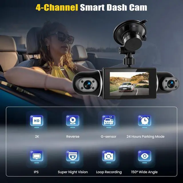 Crystal-Clear 2K Resolution with 4 ChannelsEquipped with a front camera, 2 interior cameras, and a rear camera, this 4-channel dash cam offers 2K+1080P+1080P+1080P video resolution. It can monitor the front, rear, and interior of the vehicle comprehensively, capturing critical details for safer driving and dispute resolution. Suitable for all general car models ^^ Built-in WiFi and APP ControlConnect the dash cam to your iOS or Android devices via built-in WiFi. Use the Viidure app to view records, manage settings, and preview, play, and download videos at any time.