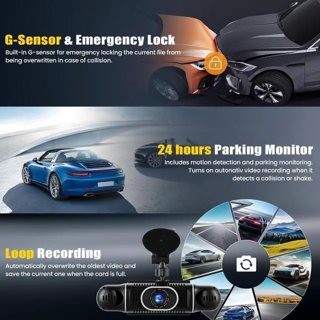 Superior Night Vision: Featuring 4 IR night vision LEDs, the dash cam records clear videos in low-light environments. The inside-facing camera can accurately capture the driver and passengers even in complete darkness, making it perfect for ride-sharing drivers. The touch screen allows for adjustable brightness for comfortable viewing day and night ^^ Loop Recording and G-Sensor ProtectionWith loop recording, the dash cam overwrites the oldest videos when the SD card is full, ensuring continuous recording. The built-in G-sensor automatically starts recording for 30 seconds upon detecting a sudden shake or collision. The accident video is locked and won't be overwritten, preserving crucial evidence ^^ Parking Assistance and 24/7 MonitoringThe backup camera displays a high resolution rear view in the rearview mirror, with park auxiliary lines for safe parking. The dash cam can record 24/7 after the car is parked (hardwire kit required, not included), protecting your vehicle from collisions, theft, and scratches. Every purchase comes with a one-year warranty and 24-hour technical support ^^ Multi-function Dash Cam1 * DVR, 1 * Rear Camera, 1 * Car Charger, 1 * User manual, 1 * Stand, 1 * Anti-skid pad.