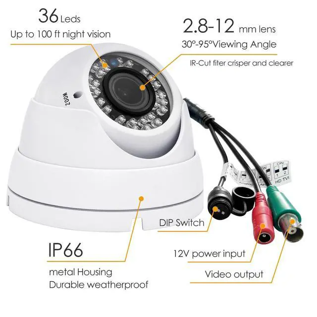 This CCTV camera supports 4 modes for video output: 1080P AHD, 1080P CVI, 1080P TVI and 960H analog (CVBS), default video output is TVI 1080P. ^^ 2.8 ~12mm Manual Focus/Zoom Varifocal lens, 36 Powerful IR LEDs for Night Vision up to 100ft. ^^ 1/ 2.9" color CMOS sensor with 2.0 Megapixel Resolution, which ensures clear and bright pictures security solution monitoring activity indoors and outdoors. ^^ True Day & Night with ICR for perfect color reproduction. ^^ The security dome camera is IP66 weather-rated housing provides protection from elements, including dust and sand, as well as harsh weather conditions.