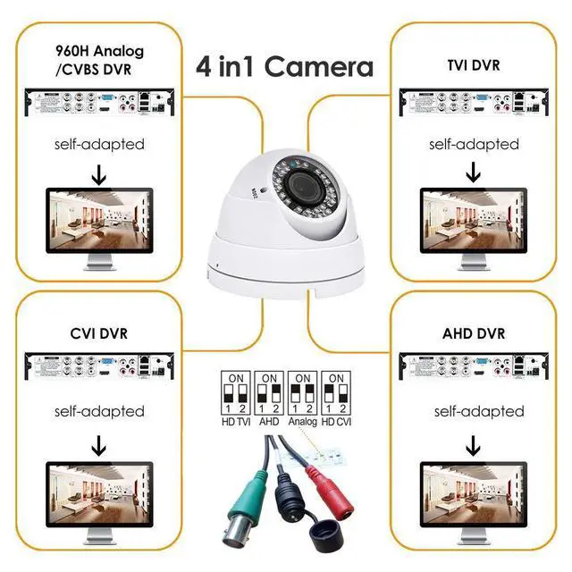 • This CCTV camera supports 4 modes for video output: 1080P AHD, 1080P CVI, 1080P TVI and 960H analog (CVBS), default video output is TVI 1080P.