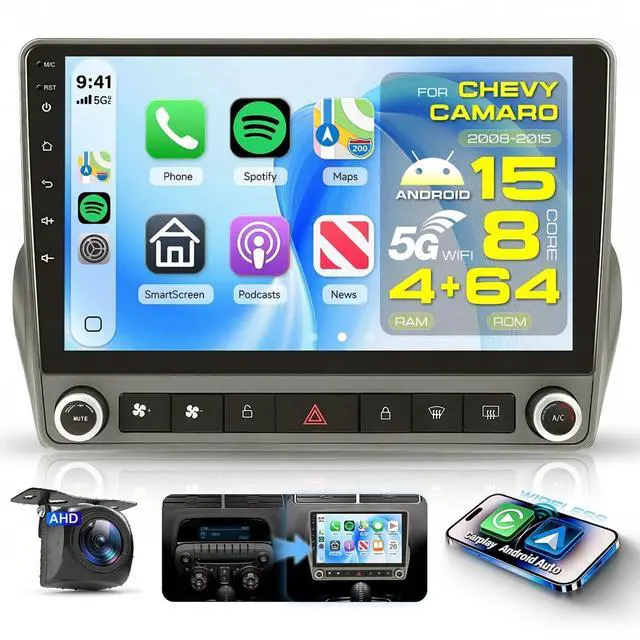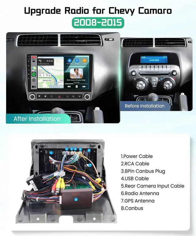 2.4GH z/5GHz Wifi dual band, allow you to enjoy smooth, drop-free streaming in the car. ^^ Bluetooth 5.0 & FM/RDS RadioBluetooth 5.0 processes faster, more stable and smoother. Support Bluetooth phonebook, hands-free call, music playback. And this camaro radio also built-in FM radio, Auto Memory Store/Preset Scan, you can listen to the radio which is your interest, listen to real-time radio, weather forecasts, and news broadcasts, FM1/FM2/FM3 87.5 -108 MHz, can be preset 18 stations. ^^ Wireless Carplay & Android Auto & Mirror LinkThis 2015 camaro radio is compatible with wired/wireless Carplay and Android Auto, navigation, making calls, listening to music, sending and receiving messages.