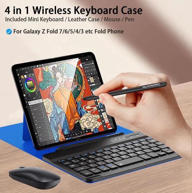 COMPATIBLE : Designed for Samsung Galaxy Z Fold phone, and 4.7 to 8.2 inch Android IOS series smartphone or tablets. Include 1 PCS Detachable Wireless Keyboard , 1 PCS Folding Leather Case, 1 PCS Wireless Mouse, 1 PCS Capacitance Pen