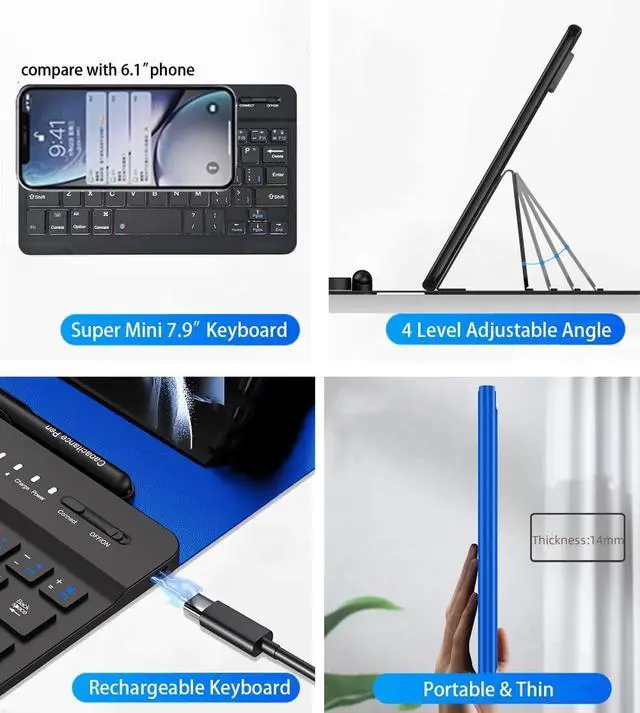 RECHARGEABLE MINI KEYBOARD : Portable keyboard is wirelessly connection without cable, the detachable compact keyboard can be split from the flip stand plain leather case. The slim keyboard case can meet your travel, office all kinds of needs