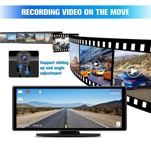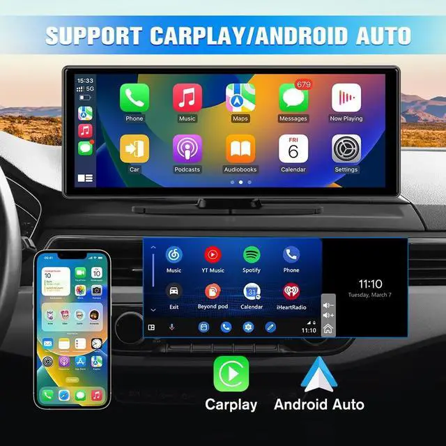 With 10.26" IPS touchscreen, this portable CarPlay screen supports wireless CarPlay & Android Auto, screen mirroring, and voice control for hands-free navigation, music, and calls. The 4K front & 1080P rear cameras offer loop recording and app-based video downloads. Upgrade your drive by a smart and safe way no installation, no hassle! ^^ Wireless CarPlay & Android Auto with Voice ControlEnjoy the convenience of wireless CarPlay screen and Android Auto via Bluetooth. With this portable CarPlay screen, you can control apps like GPS navigation, music, and calls using voice commands (such as Siri) without touching the car screen.