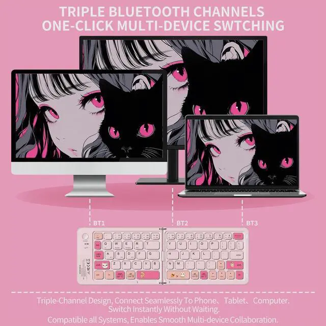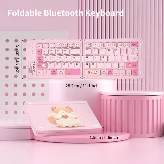 Use: Weighing only 5.93 ounces, this palm-sized travel keyboard folds easily to fit into your pocket or backpack. Simply press the CONNECT button for quick pairing with your devices. The automatic on/off and reconnection feature enhances usability. Whether you're traveling, working in a coffee shop, or just need a keyboard that doesn't take up much space, this pocket-sized keyboard is an ideal choice. It offers convenience and functionality in a small package. size 11.1 * 3.8 * 0.35 inch (open), 5.5 * 3.7 * 0.6 in (folded). ^^ Multi-device Bluetooth tablet KeyboardOur foldable keyboard with triple Bluetooth channels, which will maintains stable connectivity and fast response within 33ft operating range(Note: Turn on the Power button before connecting). Connectivity Technology Bluetooth 5.0. Supports up to 3 devices such as ipad, smartphone, tablet or laptop. It can be your perfect partner to help you reply to emails, edit excel sheets. ^^ Handheld Keyboard Rechargeable &