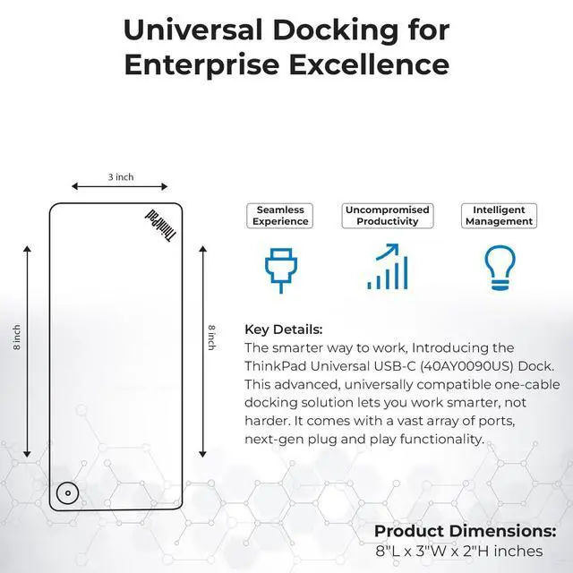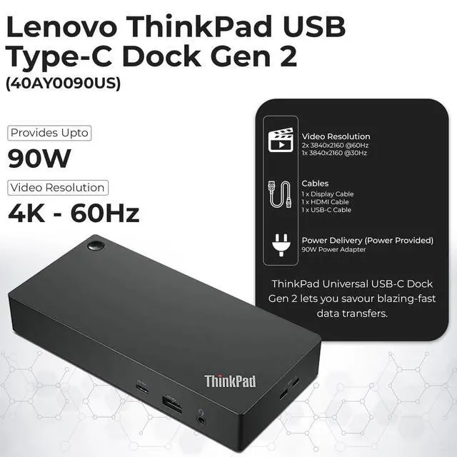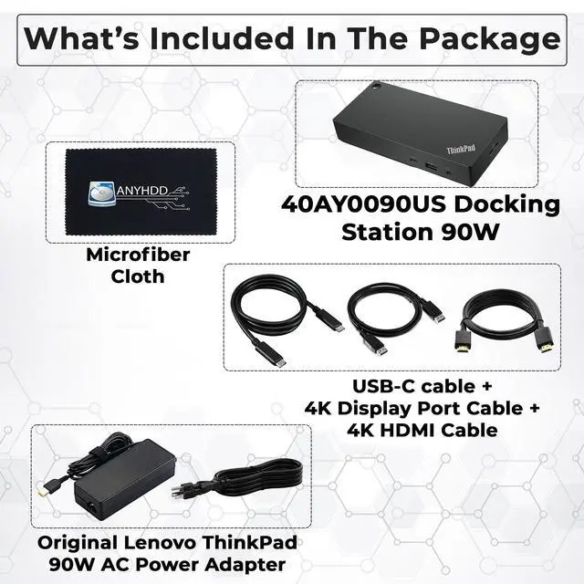 [Comprehensive Connectivity] - Seamlessly connect your devices with the thinkpad universal usb-c dock, featuring multiple ports including HDMI, DisplayPort, and USB-C ^^ [Enhanced Display Options] - Our Lenovo thunderbolt 4 docking station for laptop comes with included HDMI and DisplayPort cables, enjoy crisp and clear visuals on external monitors or projectors ^^ [Efficient Power Delivery] - This Thinkpad Dock includes a 90W AC adapter, ensuring stable power delivery to your devices while they're connected to the docking station ^^ [Package Includes] - 40AY0090US Thinkpad Thunderbolt 4 Workstation Dock, 90W AC Power Adapter, 1x USB-C Cable, 1x 4K HDMI Cable, 1x 4K Display Port Cable + Microfiber Cloth Included Supports 4K Display ^^ [] - Before purchasing please make sure your computer is USB C or Thunderbolt Compatible depending on the dock you are purchasing.