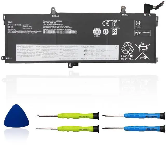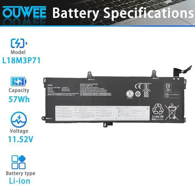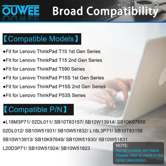 includes: 1x L18M3P71 Battery, 2 x Free Screwdrivers, 1x Instruction for Laptop battery ^^ Replacement Battery Part Numbers02DL011 L18L3P71 SB10K97649 02DL012 L18M3P71 SB10K97650 L18S3P71 5B10W13913 5B10W13914. ^^ Fully compatible and high stabilityFit for Lenovo ThinkPad T15 1st Gen Series, for Lenovo ThinkPad T15 2nd Gen Series, for Lenovo ThinkPad T590 Series, for Lenovo ThinkPad P15S 1st Gen Series, for Lenovo ThinkPad P15S 2nd Gen Series, for Lenovo ThinkPad P53S Series ^^ OUWEE Perfect After-saleRest assured with 30 days money-back and 12 months Warranty; 24 x 7 email support. Any questions you can contact with us via "Your Orders" tab in account. We are committed to resolving any situation in which our product does not meet your expectations. ^^ Safe to UseAll OUWEE products are Certified by UL / CE / FCC / RoHS for safety. Strict guidelines for compatibility, strict quality control standards to ensure the true capacity, stable current and low self-discharge and standards compliance for environment safety. We are confident in the performance of the replacement battery. ^^ AdviceIn the event that the new battery fails to be recognized upon initial installation, kindly reinstall it and verify whether the interface is fully connected.