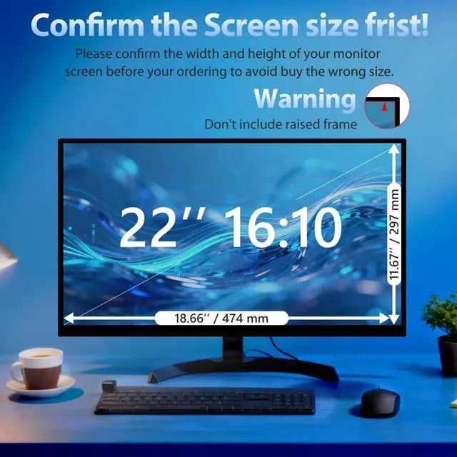 Inch Monitors Width: 18 11/16" (474 mm), Height: 11 11/16" (297 mm), Diagonal: 22" ( 558.8 mm)- Aspect Ratio 16:10. AOLWEEC computer privacy filters are designed to be perfectly compatible with HP, Samsung, Dell, Lenovo, Acer, Asus, LG, ViewSonic and other brands of monitors. You can use it anywhere you need to protect the privacy of your screen, offices, cafes, airports and trains.