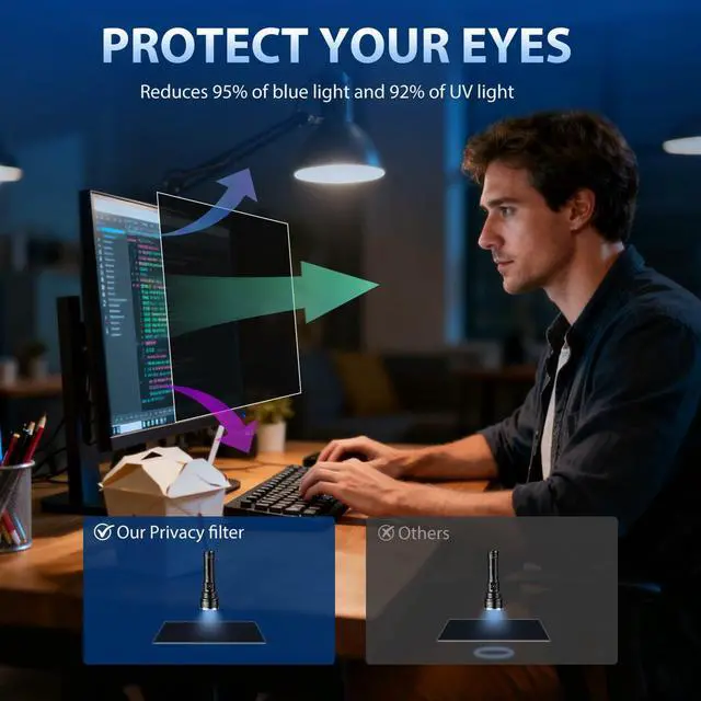 Long term exposure to computers for work or entertainment often leads to eye fatigue and dryness. Our privacy screen for computer monitor can effectively filter out up to 95% of harmful blue light. In addition to blue light, ultraviolet (UV) light is also an invisible visual killer. This product can block 92% of UV light, reducing screen damage to your eyes and providing you with a more comfortable visual experience. ^^ Package ContentYou can get 2pcs 22 inch computer monitor privacy screen filter for a better price! Each package includes 22 inch privacy screen film x2, adhesive strips x4, slide mount tabs x4, cleaning kit x2, cleaning cloth x2.