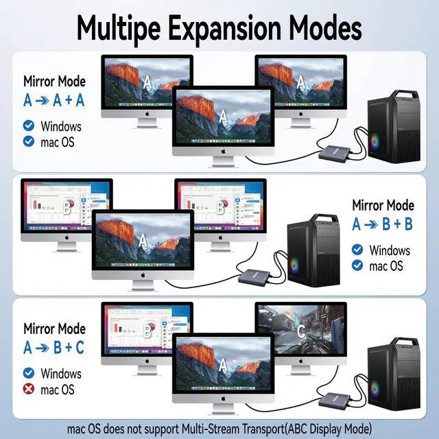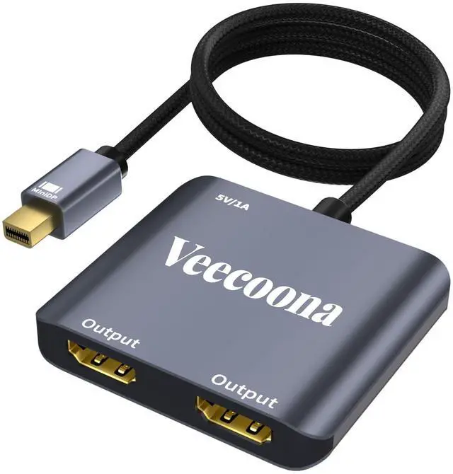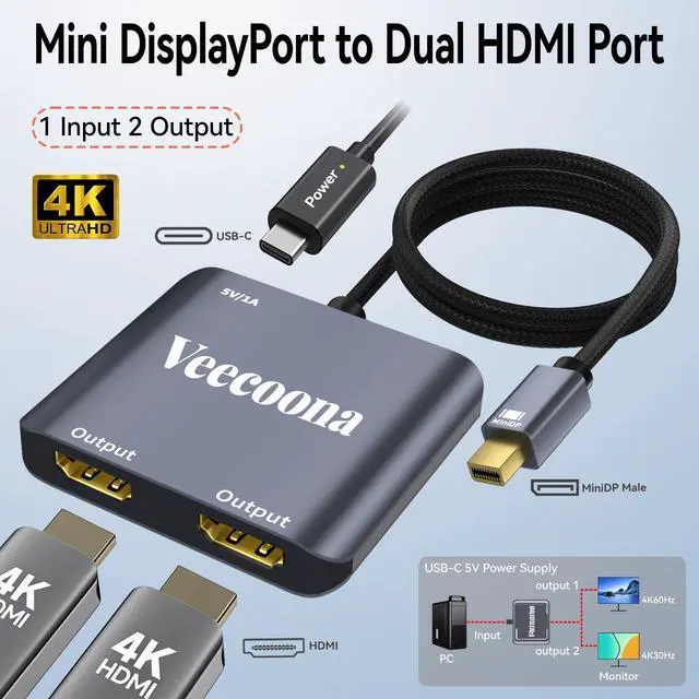 Here's how to use it: 1. Connect it to your display with a 4K@60Hz HDMI cable. 2. Power it via USB if needed. 3. Plug the Mini DP connector into your PC's Mini DisplayPort(Thunderbolt 1/2). ^^ Universal CompatibilityThis Mini Display port splitter for dual monitors works seamlessly with Windows, macOS, and Linux systems, supporting various devices including desktops, laptops, and workstations. Perfect for business presentations, home theaters, gaming setups, and office workstations. For best performance, ensure proper power connection via included USB-C cable. ^^ Premium Aluminum HousingBuilt with a durable aluminum alloy casing, this Mini DisplayPort/Thunderbolt 2 to Dual HDMI Splitter resists scratches, fingerprints, and overheating, making it perfect for travel, office, or home use. If any issues arise, our 18/7 customer support team guarantees a quick resolution. ^^ Key Tips1. Connect USB-C cable (5V/1A min. ) before use. 2. This adapter is not compatible with hubs, docking stations, KVM switches, or adaptersonly direct Mini DP connection to graphics cards/laptops is supported. 3. macOS supports mirroring (SST) but no MST extension.