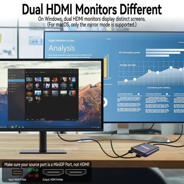 Mini DisplayPort to Dual HDMI AdapterWith a Mini DP to dual HDMI adapter, this adapter enables extended display on dual monitors for Windows PCs, supporting both SST and MST modes.