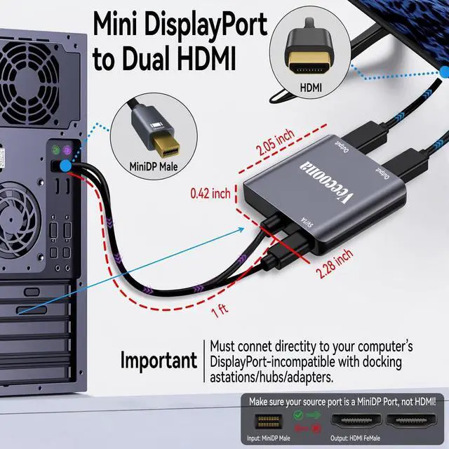 Important: Must connect directly to your computer's Mini DisplayPort - not compatible with docking stations/hubs/adapters. ^^ Plug and PlayFeaturing a hassle-free setup, this HDMI splitter for extended display works instantly.