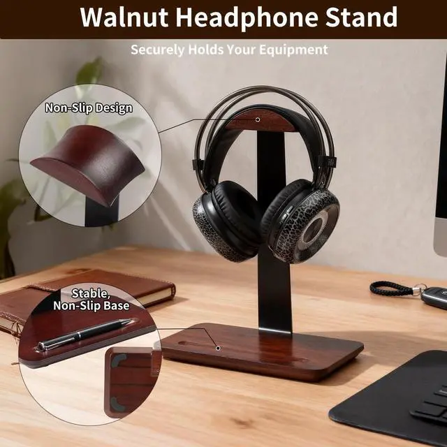 Weighted Anti-Slip Base: Designed with a stable footprint, this headphones stand for desk features non-slip pads to protect your furniture surface. The weighted base ensures the walnut headphone stand remains upright even when holding heavy studio monitor headphones ^^
