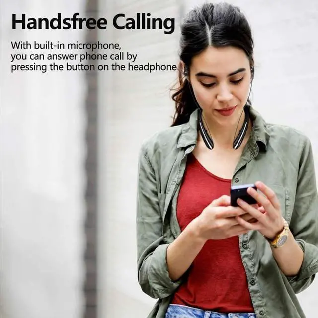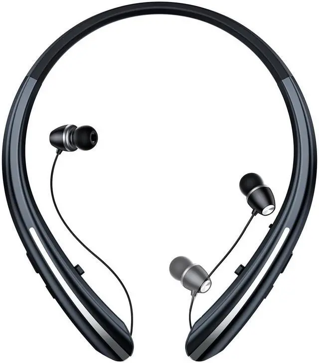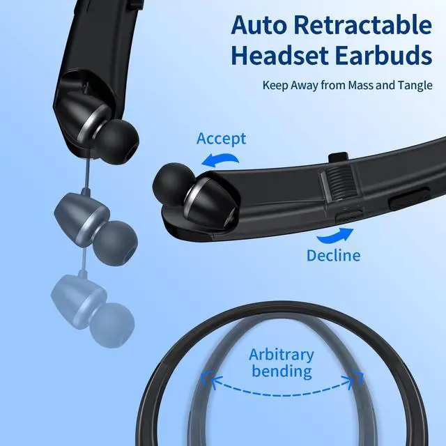 Ultra-Long Battery Life & Quick Charge Stay powered all day and night! With a massive 24-hour playtime on a single charge, these neckband headphones outlast your longest workouts, commutes, and workdays. Forget daily charging; a mere 15-minute quick charge gives you up to 3 hours of music, perfect for when you're in a hurry. ^^ Auto-Retractable Earbuds & Tangle-Free No more messy wires or struggling to wrap cords! The innovative auto-retractable mechanism keeps your earbuds neatly stored and instantly ready. Just gently pull to use, and release to automatically retract and lock.