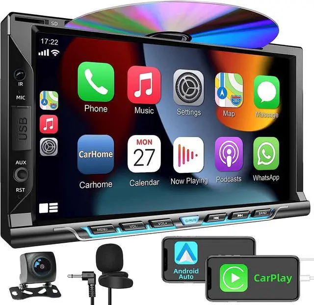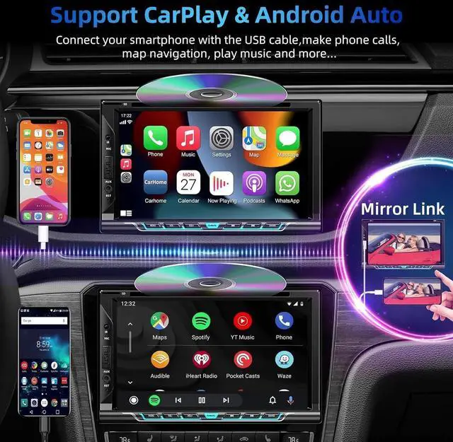 DVD/CD playerThe double din car radio can work as DVD/CD player. The usb bluetooth adapter for car stereo can play both CDs and DVDs in a wide variety of disc formats. The touch screen car stereo features 1080p to experience near HD picture quality and solid sound in a compact design. The car stereo with backup camera also show subtle shades and smoother graduation of colors, resulting in a more vibrant and natural picture. ^^ CarPlay/Android AutoThe double din car stereo compatible with Apple CarPlay, just connect with your smart phone that make it possible for you to access map navigation, phone contacts, email, notification, music and more.