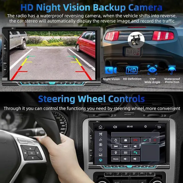 ^^ Bluetooth 5.2 & Enhanced Listening ExperienceAnswer your important phone calls without distracting your attention from the road with the car stereo with bluetooth which features a hands-free bluetooth system, pairing it with your smartphone in seconds! ( built-in clear mic and equipped with external mic jack) Wireless audio stream via bluetooth which provides a stable connectivity to your smartphone or bluetooth device, it allows you to enjoy a superior music listening experience! ^^ HD Backup Camera & MicrophoneAn HD rear camera with night vision and a microphone are included in package. The double din car stereo with an automatic display of image when in reverse.