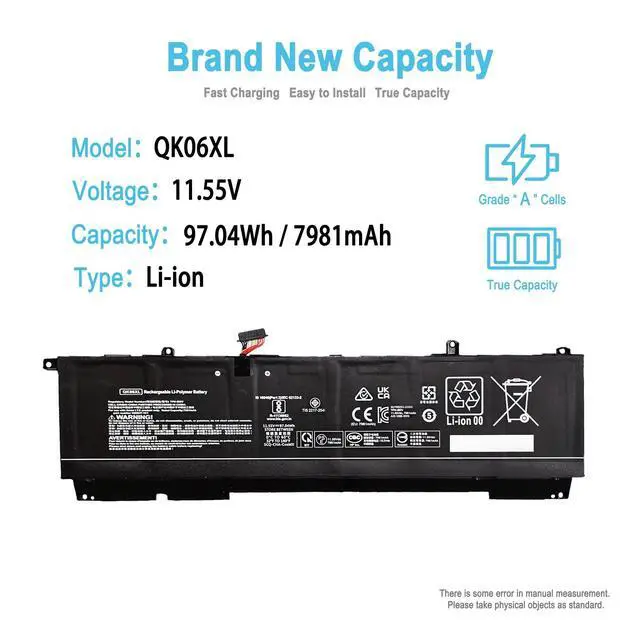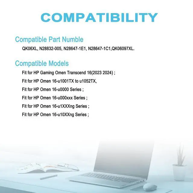 Condition: 100% brand new from manufacturer. ^^ Replacement Battery Part NumbersQK06XL, N28832-005, N28647-1E1, N28647-1C1, QKO6XL, QK06097XL. ^^ Compatible ModelFit for HP Gaming Omen Transcend 16 (2023 2024); Fit for HP Omen 16-u1001TX to u1052TX, Fit for HP Omen 16-u0000 Series; Fit for HP Omen 16-u000xxx Series; Fit for HP Omen 16-u1XXXng Series; Fit for HP Omen 16-u10XXng Series; ^^ Security/QualityAll batteries are UL, CE, FCC, RoHS safety certification, built-in over charge, over discharge, over temperature, short circuit protection. The battery offers up to 1000 charge cycles and uses grade A battery cells to improve charging speed and battery performance, ensuring performance and durability. ^^ After-Sales SupportWe support 30 days refund, 12 months warranty (refund or replace battery), 24 x 7 mail support. return window will close one month after you receive the product and you can contact us by placing your order or by clicking " Ask a question" on the seller's page.