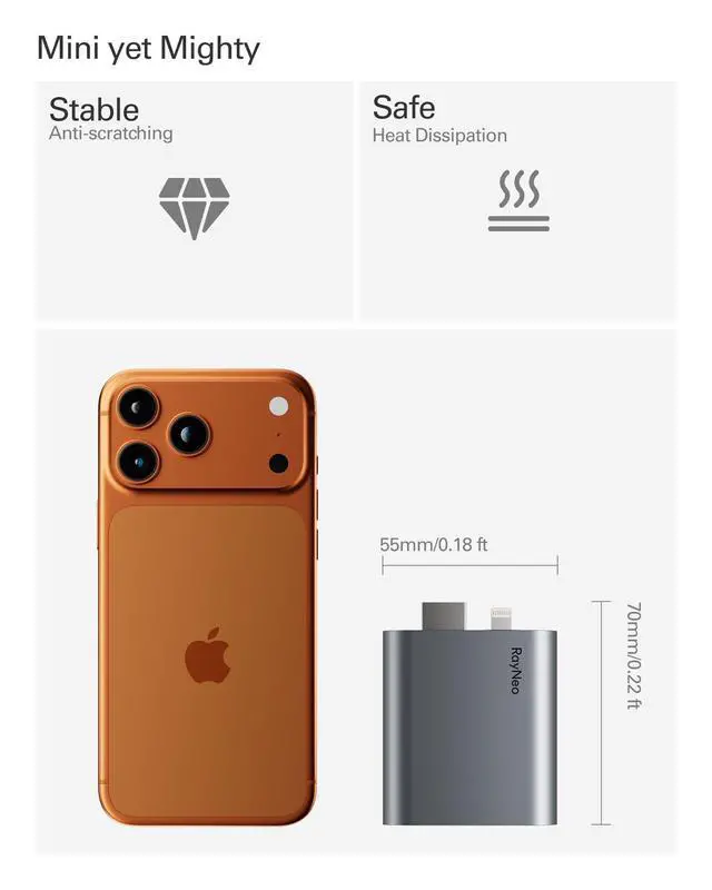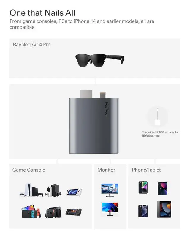 [Upgraded Version with HDR10 Support] Enhanced visual performance with HDR10 for richer contrast and more vibrant colors. Fully compatible with RayNeo Air 4 Pro AR Glasses. Requires HDR10 sources for HDR10 output. ^^ [4K@30Hz Output + Simultaneous Charging] Enjoy smooth 4K visuals while keeping your device charged perfect for long gaming or streaming sessions. *Also supports 2K@30Hz and 1080P@120Hz. ^^ [Wide Compatibility via HDMI & Lightning] Connect effortlessly to HDMI devices like Xbox, PS4/5, and iPhones (up to iPhone 14) with RayNeo smart glasses (Air 4 pro, Air 3 Series). *Lightning devices require Apple Digital AV Adapter to work together (not included).