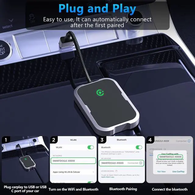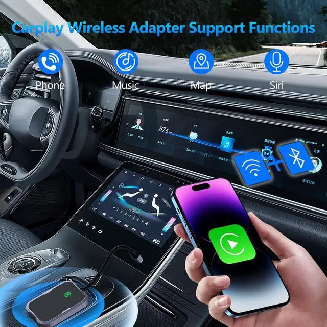 Plug and play, with support for automatic reconnectionset it once and benefit from a lifetime. ^^ Superior Stability, Almost zero delayEliminate the frustration of connection drops with our reliable CarPlay wireless adapter, ensuring a strong and steady connection that lets you stay focused on the road. Enjoy quick response times and zero delays when interacting with wireless CarPlay. Whether you're following directions or managing your playlists, the adapter ensures your CarPlay works instantly and without interruption. ^^ Super mini and Stylish, plug and play, Stay on Top of Your DrivingThe wireless CarPlay dongle boast a super mini design that blends perfectly into any car interior.