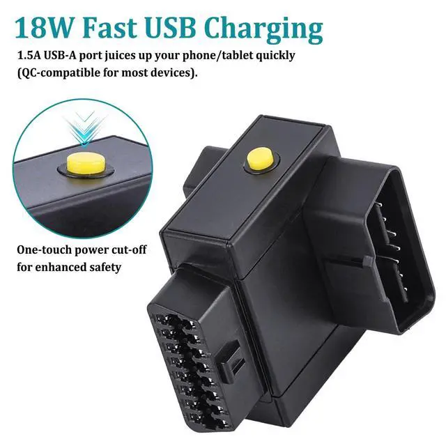 ^^ Standout Feature: 1-Press Power SwitchForget risky unpluggingthis splitters yellow power button lets you safely cut power to both OBD ports & USB in 1 second. ^^ 18W Fast