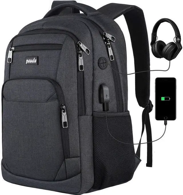 LARGE CAPACITY & WATERPROOF18 X 13 X 8 Inch. 35L. The travel business backpack is made of high density waterproof polyester. Three spacious compartment and various independent pockets organize your stuff very well, such as college supplies, travel accessories, books, clothes, bottle, umbrella and key. Moreover, the main compartment is with padded Laptop compartment, which could protect your laptop 13 Inch, 14 Inch, 15 Inch, 15.6 inch up to 16 Inch. Suitable for daily life/business/trip/school. ^^ USB PORT & HEADPHONE JACKUSB port with built-in cable, offers great convenience to charge your phone while walking, via the headphone interface, you could enjoy music and audios at the same time.