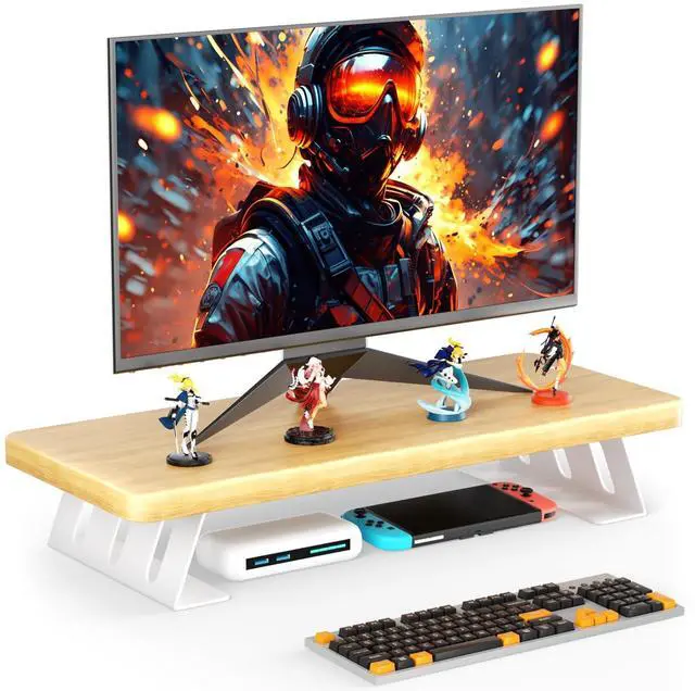 ^^ Strong & Sturdy ConstructionCrafted with high-quality thickened panels and a heavy-duty steel base, our monitor stand provides exceptional strength and stability, easily supporting up to 220 lbs without any risk of collapse or shaking during use. ^^ Quick & Easy Assembly Assembly is a breeze! Our computer monitor riser features pre-drilled holes, allowing you to effortlessly screw in the 4 brackets and install your dual monitor riser in just 2 minutes. ^^ Multifunctional StandMore than a monitor riser: use it as a laptop stand, printer base, game console shelf, or streaming box organizer. Its versatile design helps declutter any desk, making it perfect for home offices, studios, and professional setups