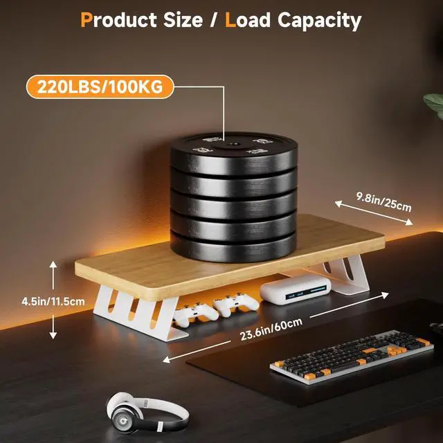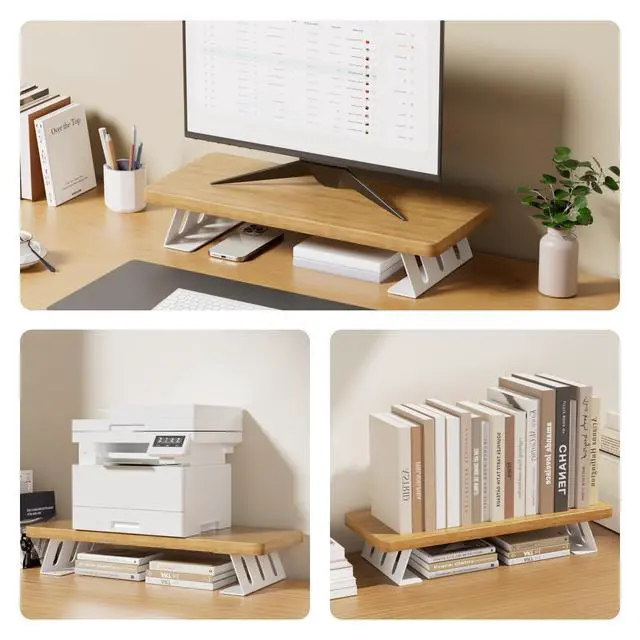 Ergonomic Monitor Riser for DeskNestNeat Monitor Stand elevates your monitor to the optimal eye level, actively reducing neck strain and improving posture. This ergonomic alignment promotes longer, more focused work sessions while minimizing physical fatigueperfect for remote work, gaming setups, and professional office environments. ^^ Maximize Storage & Save SpaceThe sleek monitor stand measures 23.6" x 9.8" x 4.5", designed to do more than just elevate your screen. It creates an organized storage zone underneath that instantly transforms your desk, giving you more usable space while keeping everyday essentials neatly tucked away.