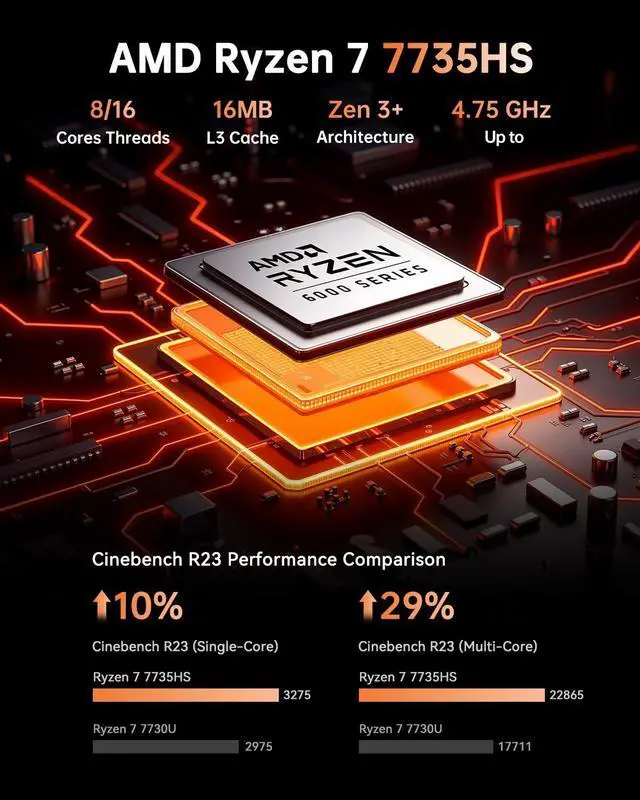 AMD Ryzen 7 7735HS This mini PC is powered by the 2026 Enhanced Edition AMD Ryzen 7 7735HS processor (8 cores / 16 threads, up to 4.75GH z). Compared with mainstream H / U series processors, it achieves an optimized balance between performance and power efficiency, maintaining stable output even under sustained heavy workloads. Whether handling intensive multitasking, content creation, programming, or light gaming, this mini gaming pc delivers fast responsiveness and consistent performance. ^^ 16GB DDR & 512GB SSD, up to 4TBKAMRUI mini pc equipped with 16GB (8GB*2 )