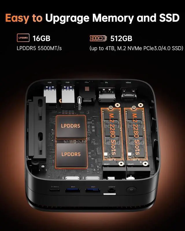 dual channel LPDDR5 5500MT/s RAM and a 512GB M. 2 SSD (upgradable to 4TB), providing faster data transfer speeds, lower latency, and improved power efficiency compared to DDR4. Features 2 M. 2 2280 slots, supporting PCIe 3.04 /PCIe 4.04 NVMe SSDs, giving you flexible storage expansion up to 4TB. Designed to support your growing storage needs while maintaining long-term operational reliability. ^^ 4K Triple DisplayPowered by AMD Radeon Graphics(12 Cores, 2200MHz Max), Supporting 4K@60Hz displays for stunning image quality and an immersive visual experience. It can connect to 3 display screens simultaneously1* HDMI + 1*DP 1.4 + 1*USB 3.2 Gen 2 Type-C).