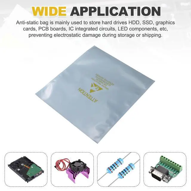 Anti-static bag is a useful tool for storing various electronic devices. Mainly used to store hard drives HDD, SSD, graphics cards, PCB boards, IC integrated circuits, LED components, data cables, electronic devices, motherboards, and other computer accessories etc. These silver Shielding Bags prevent electrostatic damage during storage or shipping. ^^ Anti static bag is in size of: 8.7 x 9.4 inch (22x24cm) total width and height, 0.01 inch( 0.15 mm) double-sided thickness, material: CPP