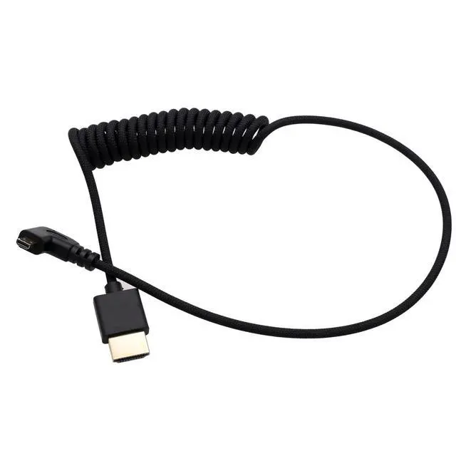 We make custom cables8K 4K 60p micro HDMI to full-size HDMI spiral cable for camera to field monitor recorder. [Features] Lossless and stable signal transmission with HDR, 3D, audio, video, Ethernet. 3-layer aluminum foil braid shielding wire protects against EMI/RFI interference. Conductor is tinned copper. Gold-plated corrosion-resistant connector.
