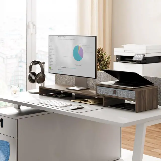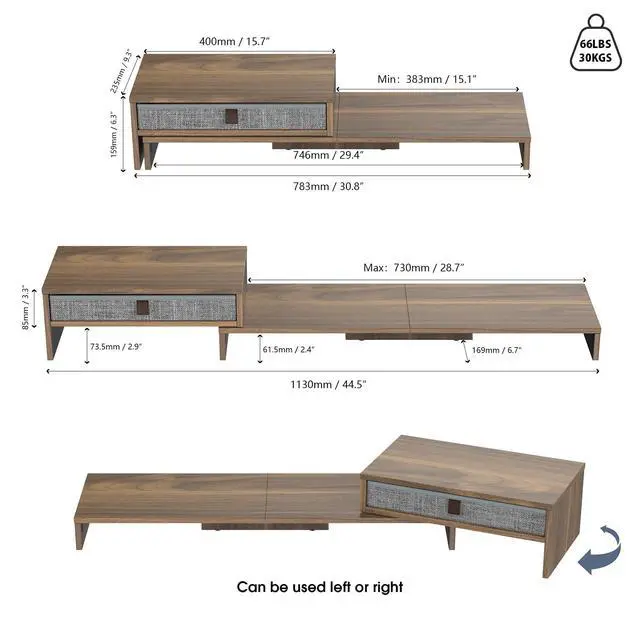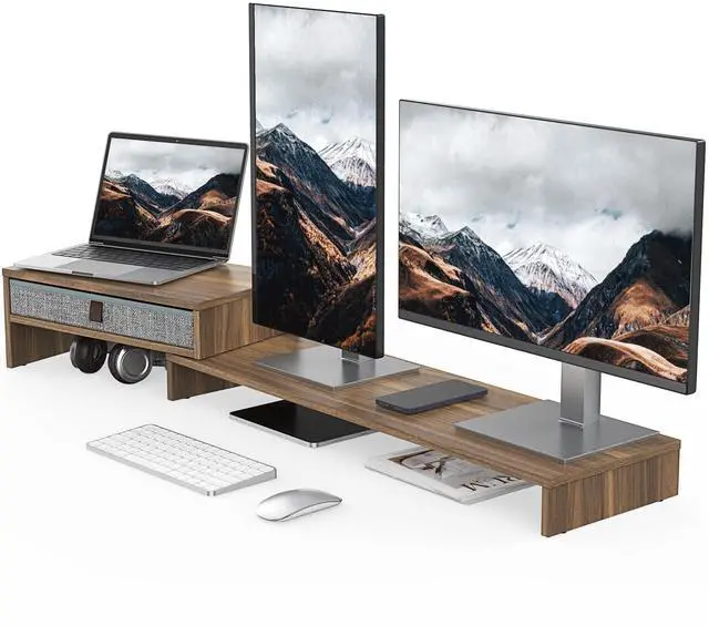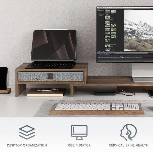 Avoiding Shoulder Pain at WorkRaise monitor 4inch so that your eyes are at eye level. Allows you to sit up straight, effectively reducing the stress on your neck and spine. The improved posture will keep you to focus more and to prevent cervical spondylosis. ^^ Longer Size with More SpaceAt longest 42.7 inch wide, this laptop riser is big enough to support two monitors. Depending on your setup, you may even have room to place a speaker or another device in the middle. Creates enough space underneath for smaller desk essentials, or to tuck your keyboard and mouse away.