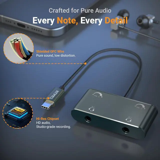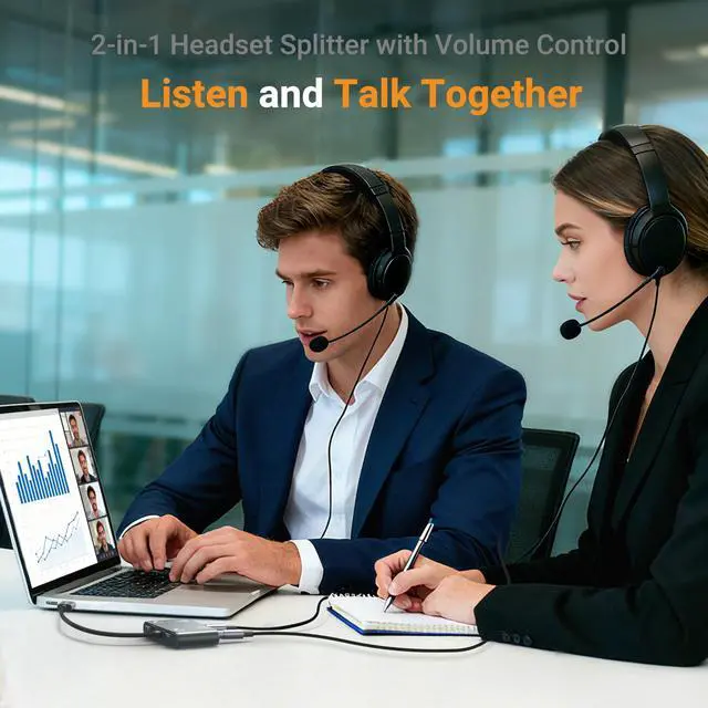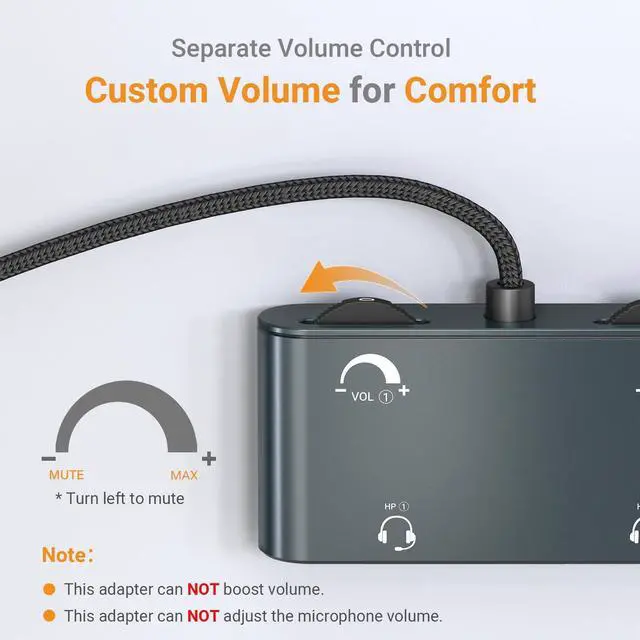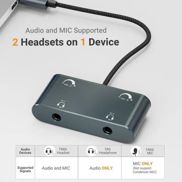 [Dual Headset Splitter for Audio and MIC] Connect two headsets to one device for listening and talking at the same time, perfect for calls, meetings, or training. ^^ [Support 2x TRRS Micophone Input] Works with two mono TRRS microphones for dual-person interviews, podcasts, or co-hosted recordings. (Not compatible with powered or stereo microphones. ) ^^ [Independent Volume Controls] Adjust the volume to your preferred level through the dedicated wheels without affecting your partners listening experience. ^^ [Hi-Res Sound] Built-in Hi-Res chipset delivers clear HD audio up to 192KHz/16-bit and lossless, studio-quality recording up to 48KHz/24-bit.