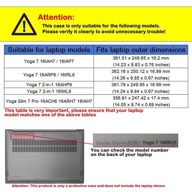This case fits Model: Lenovo Yoga 7 16IAH7 Lenovo Yoga 7 16IAP7 Lenovo Yoga 7 16ARP8 Lenovo Yoga 7 16IRL8 Lenovo Yoga 7 2-in-1 16AHP9 Lenovo Yoga 7 2-in-1 16IML9 Lenovo Yoga Slim 7 Pro 16ACH6 Lenovo Yoga Slim 7 Pro 16ARH7 Lenovo Yoga Slim 7 Pro 16IAH7You can check the model number on the back of your laptop.