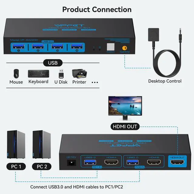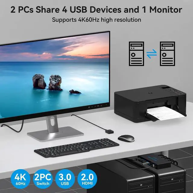 KVM Switch 1 monitors 2 computers: This KVM Switches supports sharing a set of mouse keyboard printers and quickly switch between them with the push of a button, improving office efficiency and gaming experience ^^ HDMI 4K