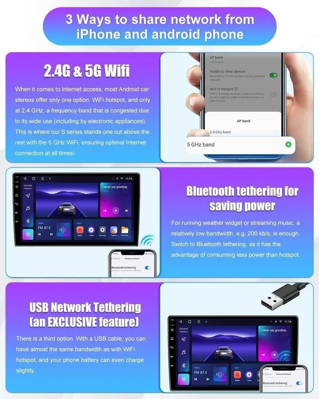all the original functions: steering wheel control, reverse camera, USB/AUX port and so on. Upgrade your car effortlessly with this easy-to-install stereo system ^^ Wireless Carplay & Android AutoWireless carplay and Android Auto function, no need to connect USB cable, support to use smart voice assistant or touch the display, you can get directions, make calls, send and receive messages, and enjoy music etc. A smarter, safer and more fun way to use your phone in the car, and keep you stay focused, connected and entertained. Now you can enjoy all the benefits of your phone without taking your eyes off the road ^^ Super System SpeedThis latest car radio is equipped with advanced Android 13 system, 4 core, 4+32G, provides faster and smoother response speed. Compatible with not only FM radio, but the RDS radio, providing more radio options. Combined with well-designed touch key, this car stereo will absolutely provide better driving experience ^^ Faster Bluetooth 5.0 with MicrophonesCompared with Bluetooth 4.0, our radio new Bluetooth 5.0 offers double the transmission rate, also you can connect your phone with this touchscreen car radio via bluetooth to listen your favorite songs, follow the map, make phone calls and so on.