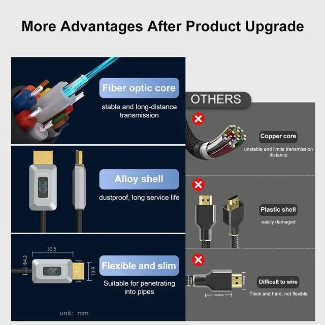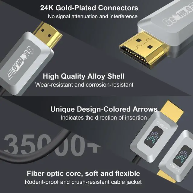 Tips: Please pay attention to the cable direction before wiring into the wall, the fiber optic cable is directional. ^^ High Quality & DurableThis high-quality fiber optic cable features triple shielding to ensure stable and clear signal transmission, alloy shell, and flexible material sheath for longer service life, breaking through testing 35000+. Supports Dynamic HDR, HDCP 2.2 / 2.3, 12-bit