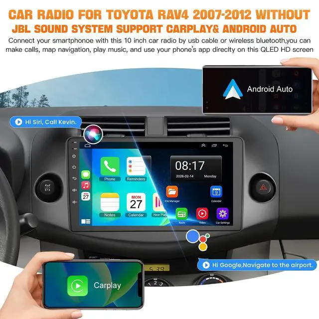 Applicable Car Models- Designed exclusively for the Toyota RAV4 2007-2012 without JBL Sound System models, this stereo seamlessly replaces your factory unitpreserving the original look while unlocking smart features. Confused about fit? Send us a photo of your dashwell help confirm! ^^ CarPlay & Android Auto (Wireless/Wired)- Turn your RAV4 into a smart vehicle! This advanced Toyota RAV4 Radio gives you seamless wireless or wired access to maps, music, and messageskeeping you connected safely and conveniently. Whether youre an iPhone or Android user, enjoy a smarter, safer, and more intuitive driving experience ^^ Mirror Link on Your RAV4 Stereo (Wireless/Wired)- Mirror your phones screen directly onto this premium RAV4 Stereo.