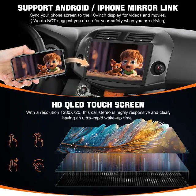 Perfect for sharing videos, navigation, and apps not yet supported by CarPlay or Android Autoall with a simple tap. ^^ Bluetooth & Voice Control Built for RAV4- Enjoy true hands-free freedom. This Toyota RAV4 Stereo lets you make calls, play music, and control features using clear voice commandsall while keeping your focus on the road. ^^ QLED Touch Screen& High-Resolution 1280x720- Upgrade your dashboard with a vibrant QLED touchscreen designed specifically for the RAV4 2007-2012. Enjoy ultra-sharp graphics, smooth touch response, and brilliant clarity that makes every drive more engaging.