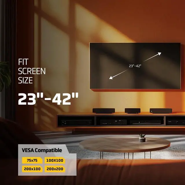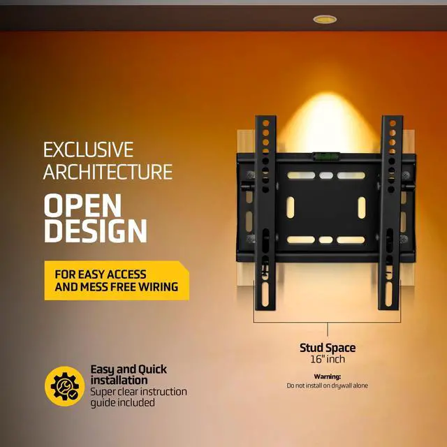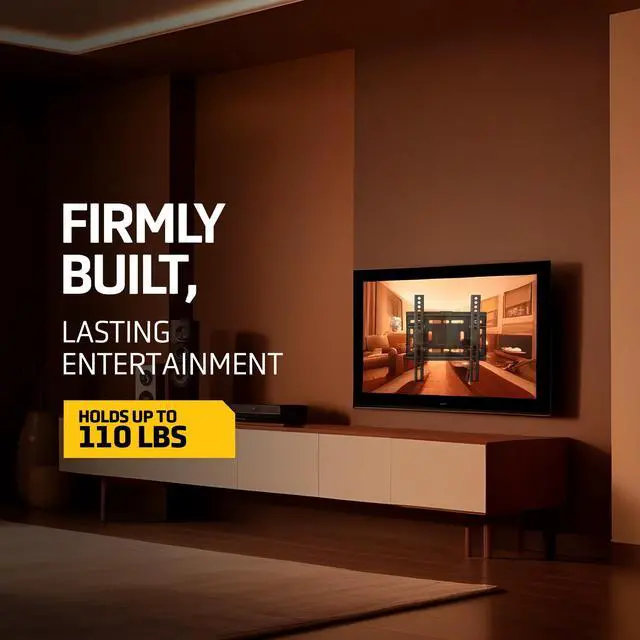 UNIVERSAL COMPATIBILITY - Fits most 23-42 inch flat TVs up to 110 lbs with VESA patterns from 75x75mm to 200x200mm. Designed for wood studs 16" inches apart (not for drywall alone) ^^ HEAVY DUTY - Securely supports TVs weighing up to 110 lbs, ensuring stability and reliability for your entertainment setup ^^ ULTRA-SLIM DESIGN - Stands just 2.2 inches from the wall, providing a sleek, space-saving look. ^^ ANTI-GLARE FEATURE - Offers a +5-10 tilting function for optimal viewing angles and reduced glare ^^ OPEN DESIGN - Enhances ventilation, provides easy wire access, and includes automatic spring locks for quick TV removal ^^ EASY INSTALATION - Includes clear instructions and all hardware for a simple 3-step setup, and a Hook-on Bubble Level (Included in Components Package), plus a 3-year protection guarantee