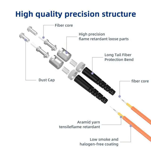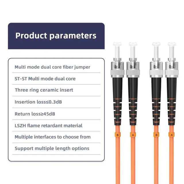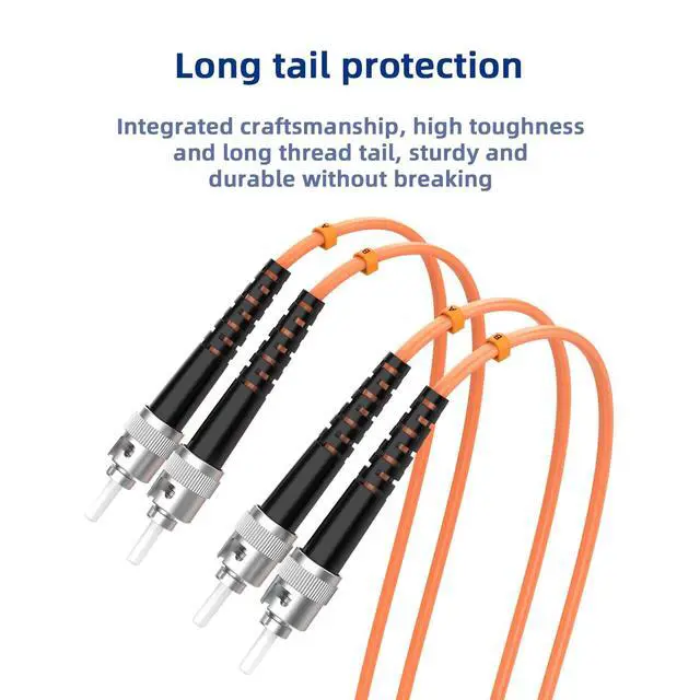 is capable of achieving maximum transmission distances of 550 Meters at 850nm for 1Gb Ethernet, 82m for 10Gb Ethernet, The bandwidth is 500/500 MHz. km @850/1300nm, ensuring high-speed data transmission ^^ Durable and FlexibleThe om1 multimode fiber designed with high-quality materials for enhanced durability and flexibility, ensuring long-term reliability. The embossed A/B position names on the duplex clip and jacket tag rings facilitate easy identification during installation and troubleshooting. It is designed with a bendable feature and a 7.5 mm minimum bend radius, Ideal for SAN network cabinets that require multiple elbows in the cabinet and for small area high-density installation ^^ Low Insertion LossThe multimode duplex st fiber patch cord provides stable and low insertion loss for optimized signal integrity and minimal data loss.
