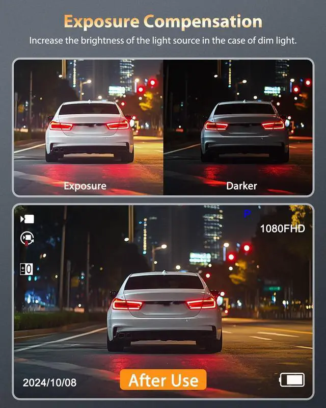 ^^ Advanced Night Vision & Exposure ControlEquipped with eight infrared LEDs and smart exposure adjustment, this dash cam excels in darkness. The anti-glare night vision captures clear details like pedestrians, while exposure control prevents overexposure from headlights/sun glare and enhances shadows. Maintains consistent, clear image quality on unlit roads or in parking garages. ^^ Parking Mode, Reverse Assist & GPS LoggingAutomatically activates parking mode when reversing, displaying real-time rear footage with trajectory guidelines for safe maneuvering. Built-in GPS precisely logs routes, speed, and location, stamping videos with coordinates for legal verification.