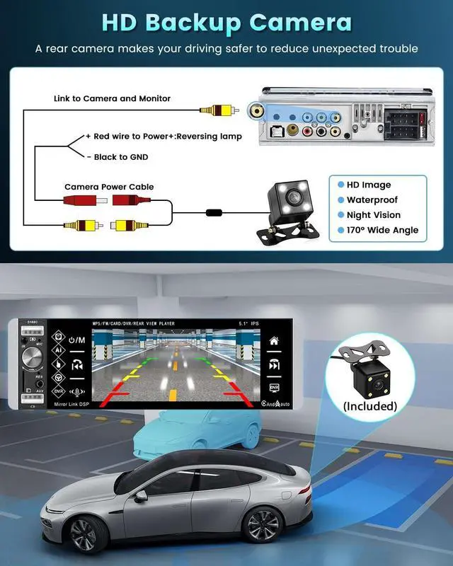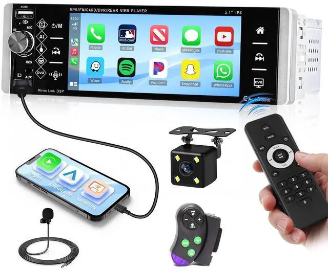 Support Android/ Iphone Mirror Link, through phone's original USB line Can synchronized to the on-board screen ^^ Bluetooth & AM/FM RadioThis single din touchscreen car radio allows you to make hands-free calls and play Bluetooth music anytime, anywhere by pairing with your mobile phone via Bluetooth. 1 din car play stereo features built-in AM/FM/RDS supports one key to automatically search for stations and save frequently used stations in the menu bar ^^ Backup Camera & SWCThe 5.1 inch car audio receiver comes with a 4 LEDs reversing camera, and the reverse gear is automatically switched while parking, which is convenient for monitoring the rear of the car.