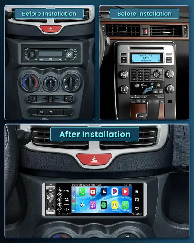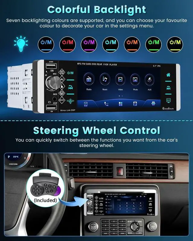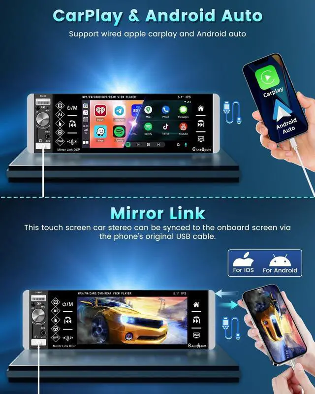 Single Din Touch Screen Car StereoThis bluetooth car player with 5.1 inch 1024*600 touch screen resolution supports 1080P video format, supports seven-color backlight, Volume knob designed. Dual USB, one for media playing, one for fast phone charging. With AUX-in, TF card, RCA-out port ^^ Wired Apple Carplay/Android Auto/Mirror LinkThis touch screen car stereo supports the use of Carplay and Android Auto. You can connect the single din head unit by using a USB data cable, so that you can connect the phone book, mail, notification, map navigation APP, music on the phone.