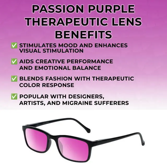 Passion Purple Lenses: Boost creativity & mood with purple tones, designed for stress relief & glare reduction. Ideal for brainstorming & artistic activities.