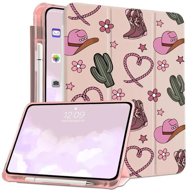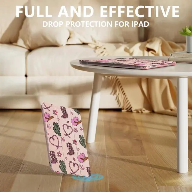Protection: This Retro girly western case for ipad is made of two materials. The comfortable and soft silicone and high-quality durable TPU material provide a comfortable touch for the pad. The back of this cute cowgirl pattern case for ipad is made of soft TPU, which provides full body protection and is more durable than traditional silicone materials. It is less prone to yellowing, prevents scratches, and maximizes the protection of your pad from damage and scratchesAuto Wake/sleepBuilt-in magnetic strip, our cute cowgirl pattern case for ipad can automatically wakes or puts your tablet to sleep when the lid is opened and closed, protecting and extending battery life; precise cutout also completely supports newest touch ID key function. Built in pen holder ensures the safety of your pencil. Adjustable angleThe trifold stand shell design of this Retro girly western case forapple ipad can easily change the angle to meet your viewing and typing needs. This stylish hat print case for ipad can be folded into a stable triangle, firmly supporting your pad. Whether it's work, study, or watching movies, they can meet your needsPerfect