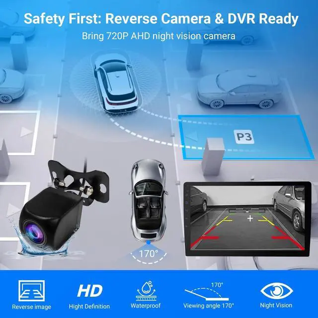 Features split-screen and PIP functionality for enhanced convenience and visibility. ^^ DSP Sound Enhancement & EQ Settings with 18W Output Customize your audio experience with DSP, EQ, and ASP sound settings. Delivers powerful 18W output per channel for crisp, high-quality sound whether youre listening to music, radio, or navigation prompts. ^^ 720P AHD Reverse Camera with 140 Wide Angle & Universal Fit Park with confidence using the included 720P AHD rearview camera offering a 140 wide viewing angle. Compatible with most vehicle models including Toyota, Chevrolet, Honda, and more.